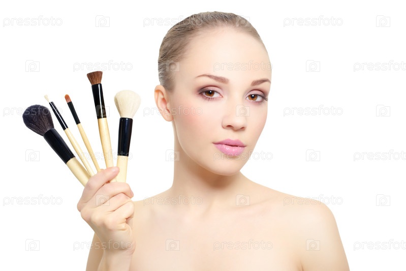 Красивая девушка с кистями для макияжа, изолированная на белом