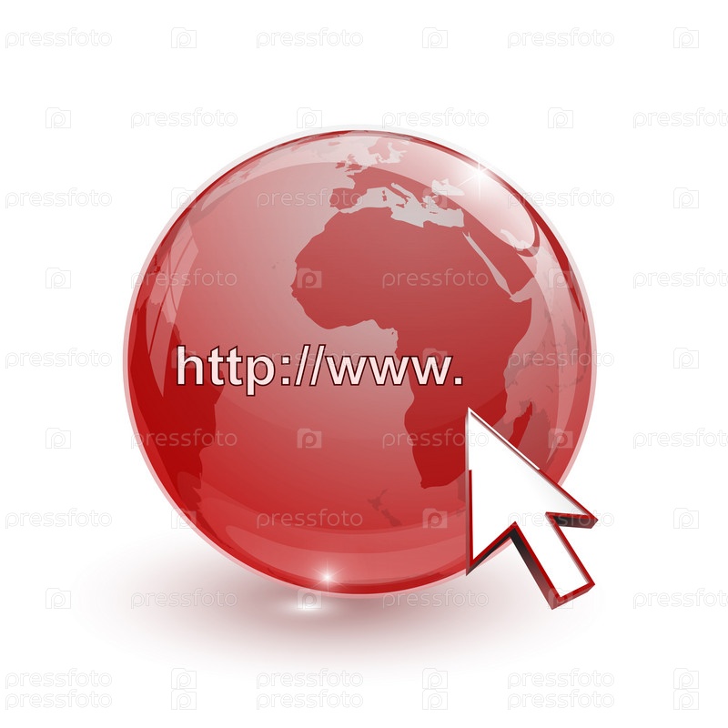 Стеклянный трехмерный красный глобус, курсор и интернет-адрес