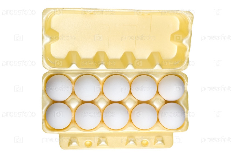 Куриные яйца в упаковке на белом фоне