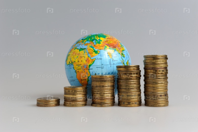 Пять стопок монет с глобусом на сером фоне