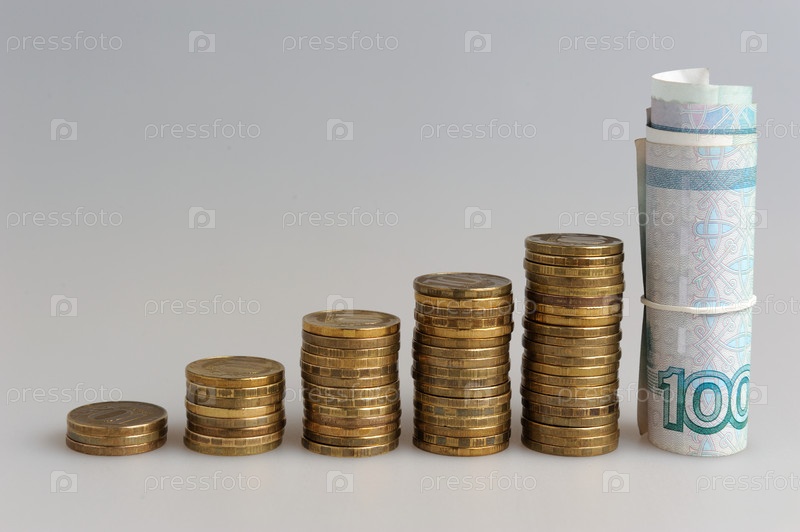 Пять стопок монет и купюры на сером фоне