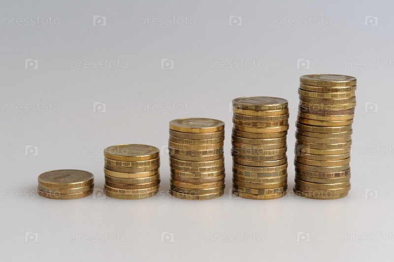 Пять стопок монет на сером фоне