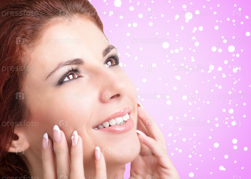 Портрет красивой девушки на розовом фоне с летящим снегом фоне. Красота и уход за телом