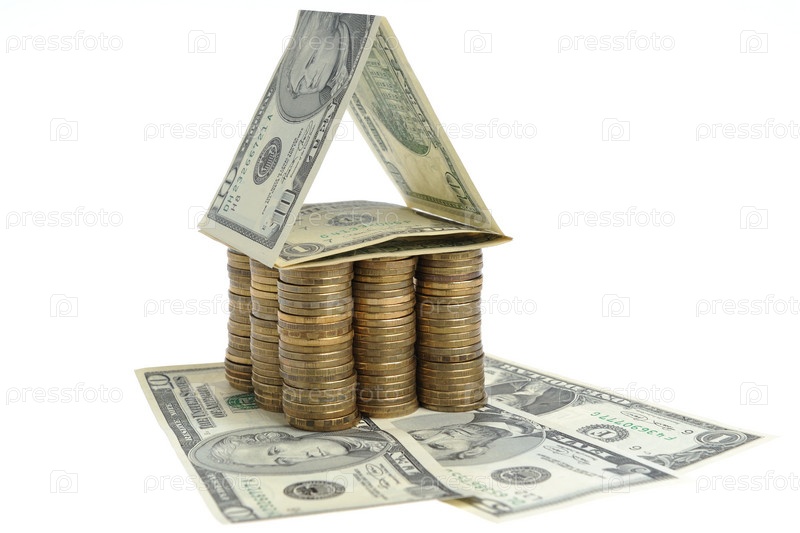 Дом из монет на долларах и белом фоне