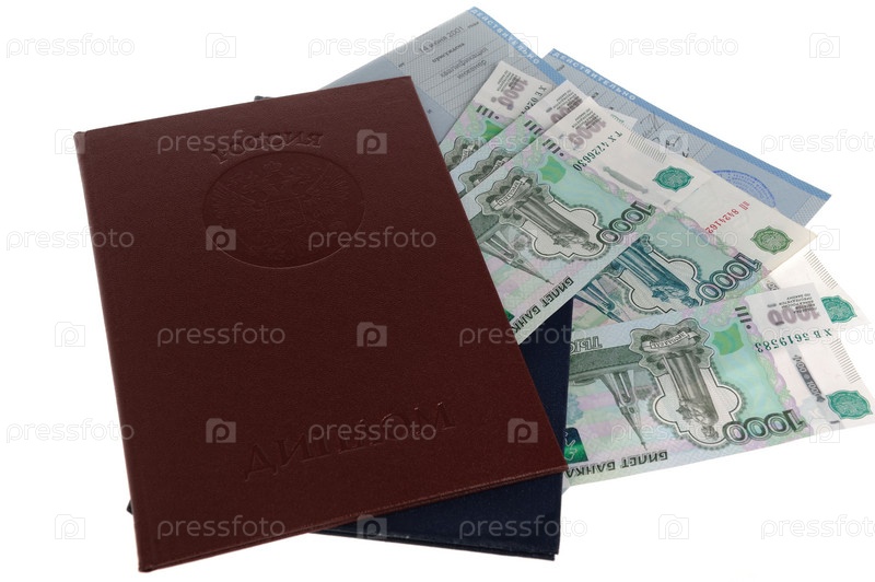 Дипломы о высшем образовании с приложениями и деньгами на белом