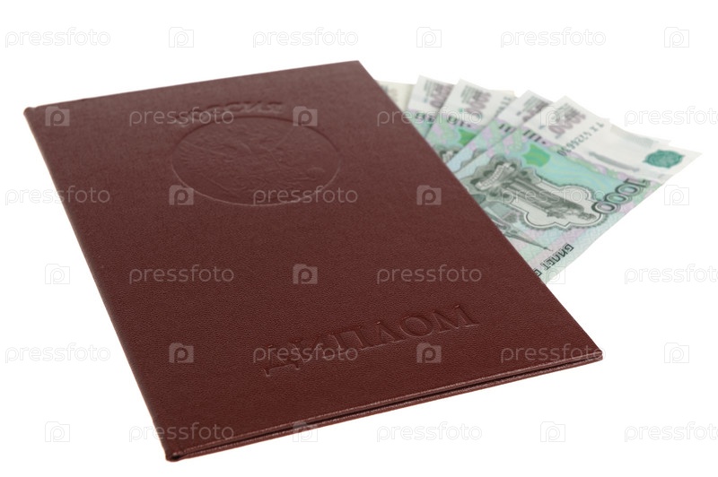 Красный диплом с вложенными деньгами на белом фоне