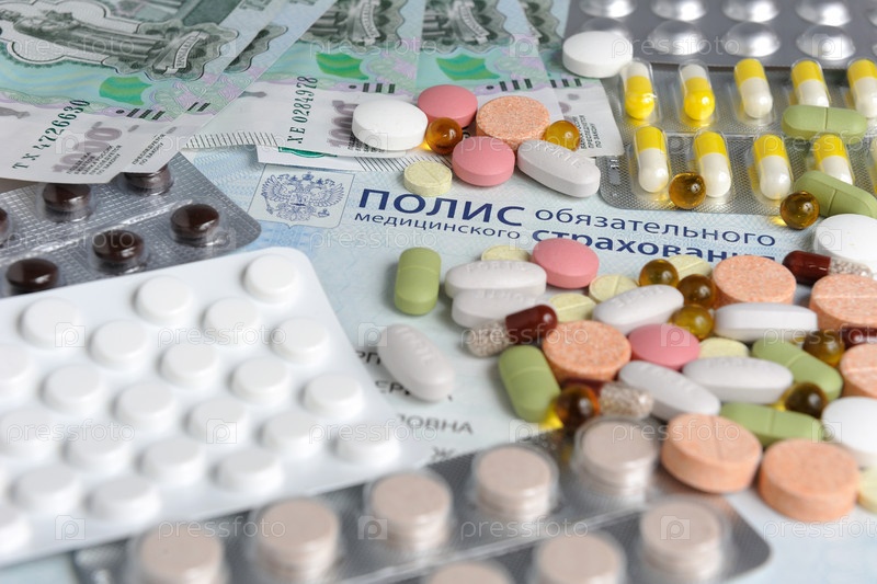 Таблетки и деньги на медицинском полисе