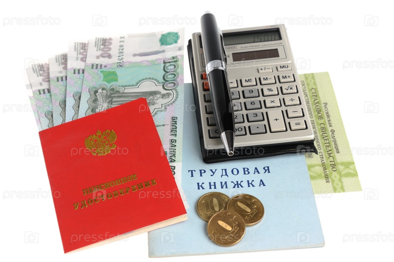 Пенсионные документы, деньги, калькулятор и ручка на белом фоне