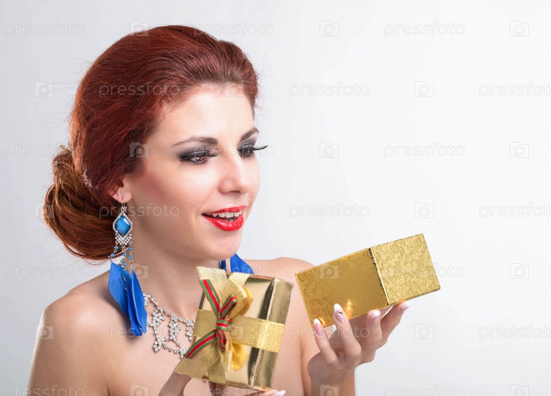 Красивая девушка открывает золотистую коробку с праздничным подарком