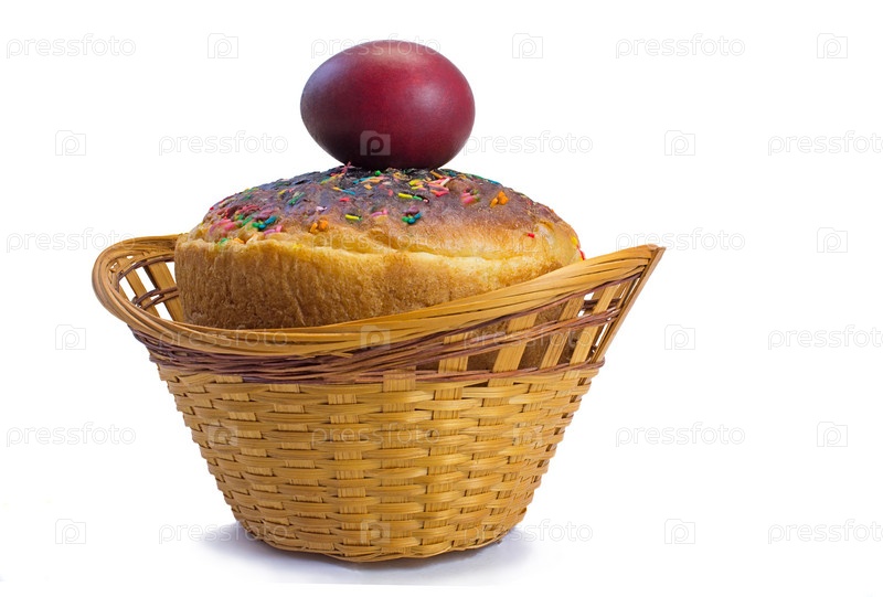 Красные пасхальные яйца и пасхальный хлеб в корзине на белом фоне