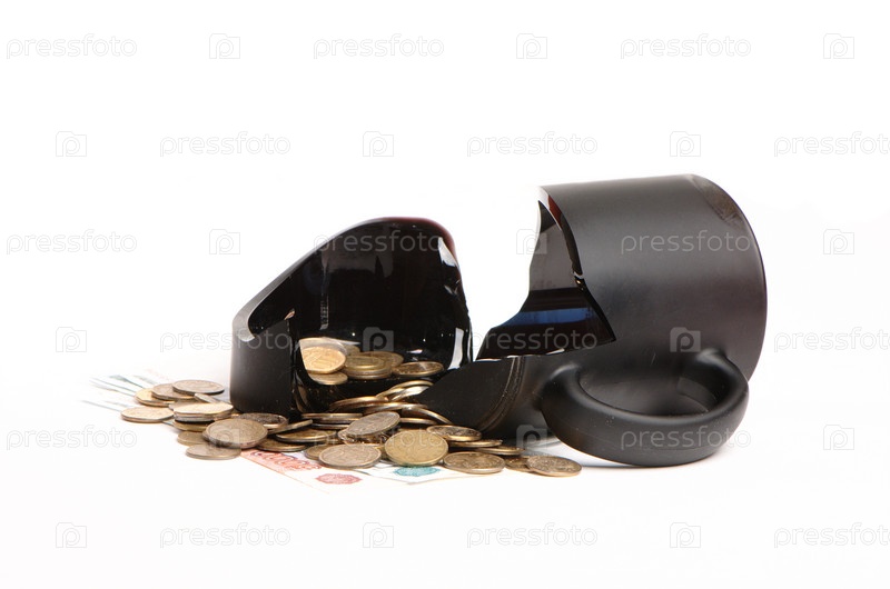 Банкноты, монеты и разбитая кружка на белом фоне