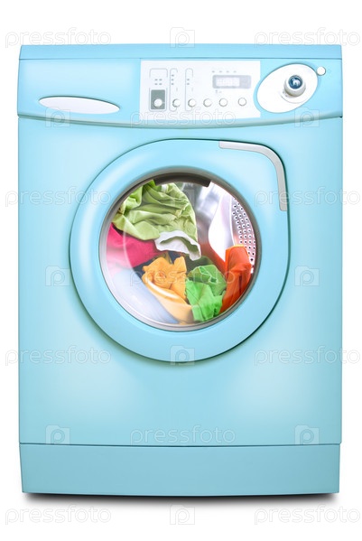 Голубая стиральная машина на белом фоне