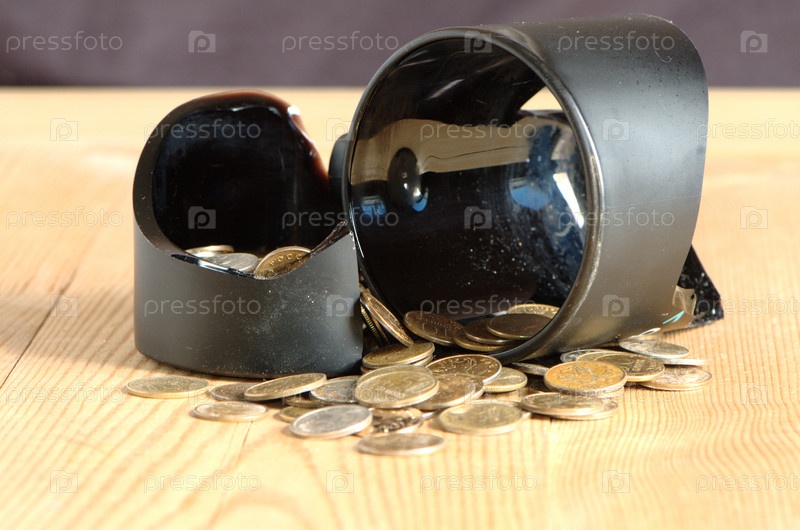 Разбитая кружка и монеты на деревянном столе