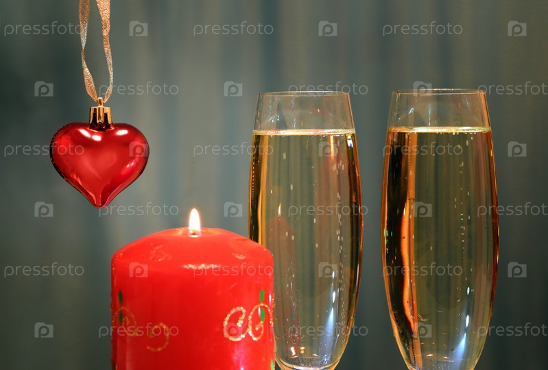 Бокалы с шампанским, сердце и свеча