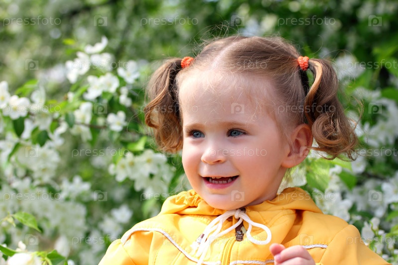 Маленькая девочка возле цветущей яблони