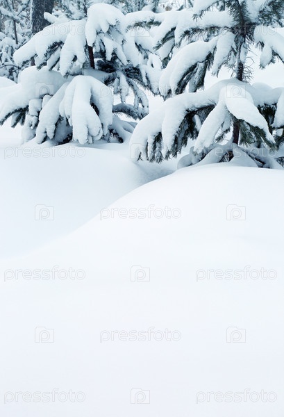 Заснеженные ели и сугробы снега