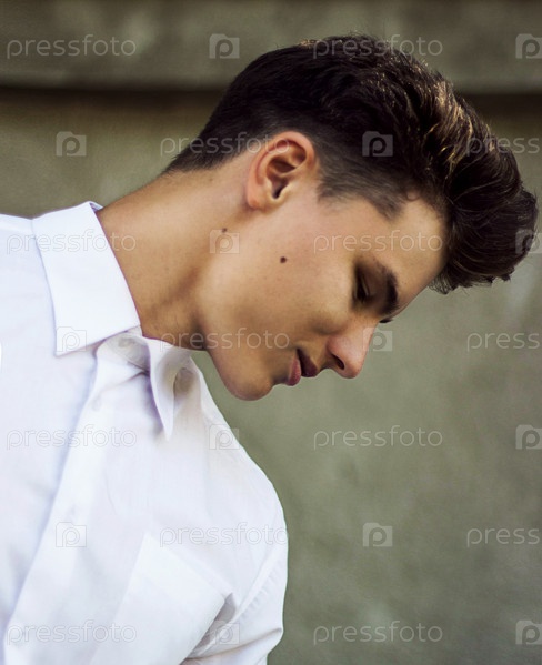 Молодой мужчина в белой рубашке смотрит вниз