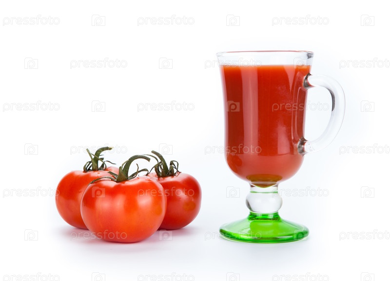 Красные помидоры и стакан томатного сока на белом фоне