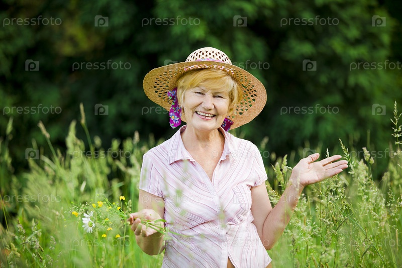 Счастливая пожилая женщина в соломенной шляпе