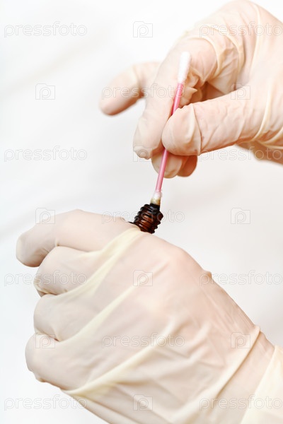 Медсестра окунает ватный тампон в бутылку с йодом