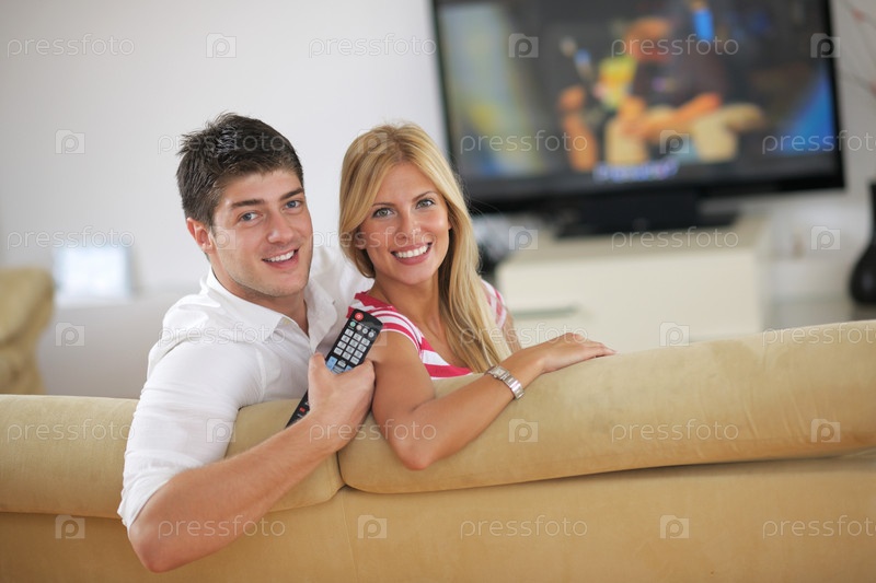 Молодая пара смотрит телевизор дома