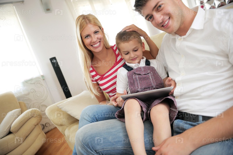 Семья использует планшетный компьютер