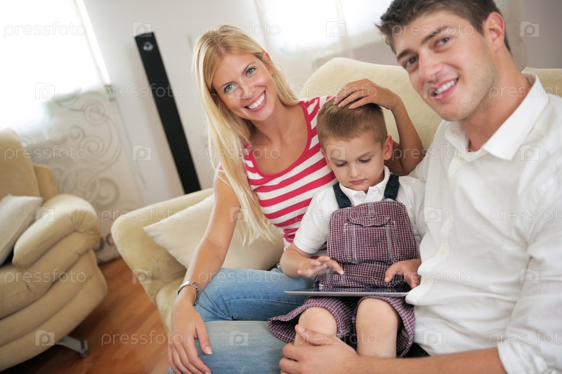Семья использует планшетный компьютер