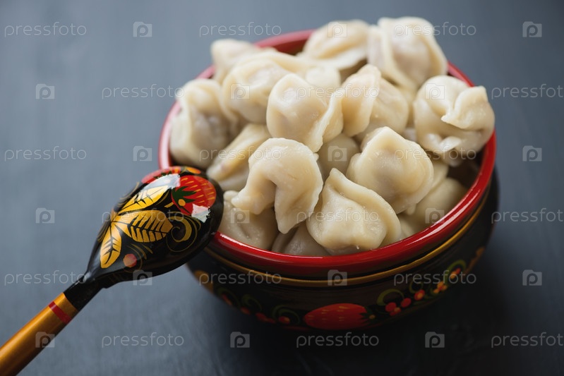 Вареные пельмени в деревянной миске с хохломской росписью