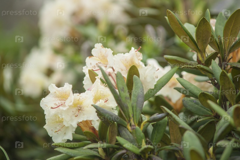 Цветущие белые рододендроны