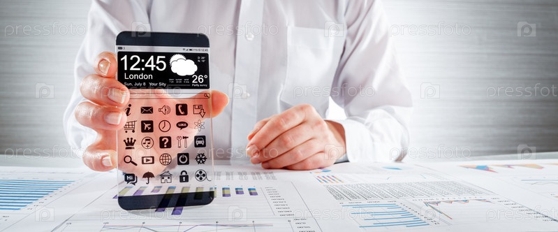 Смартфон с прозрачным экраном в человеческих руках