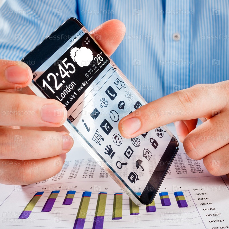 Смартфон с прозрачным экраном в человеческих руках