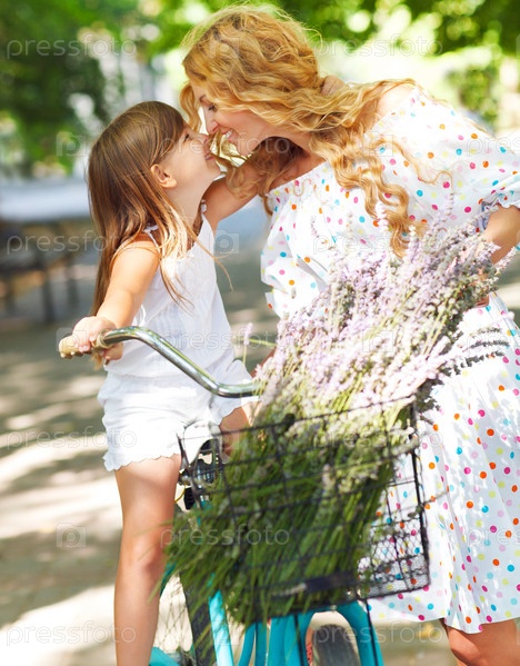 Красивая счастливая молодая женщина на велосипеде с дочерью
