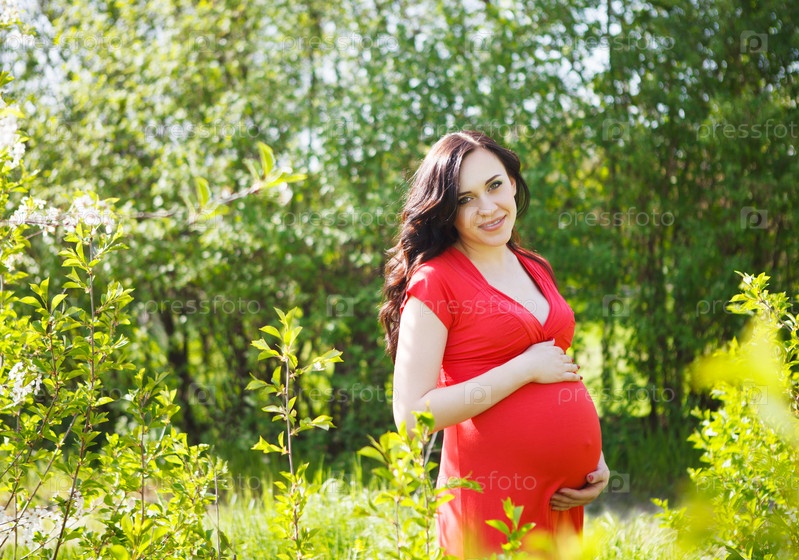 Портрет красивой беременной женщины в красном платье