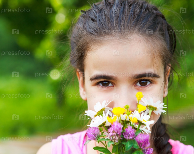 Портрет девочки с букетом весенних цветов