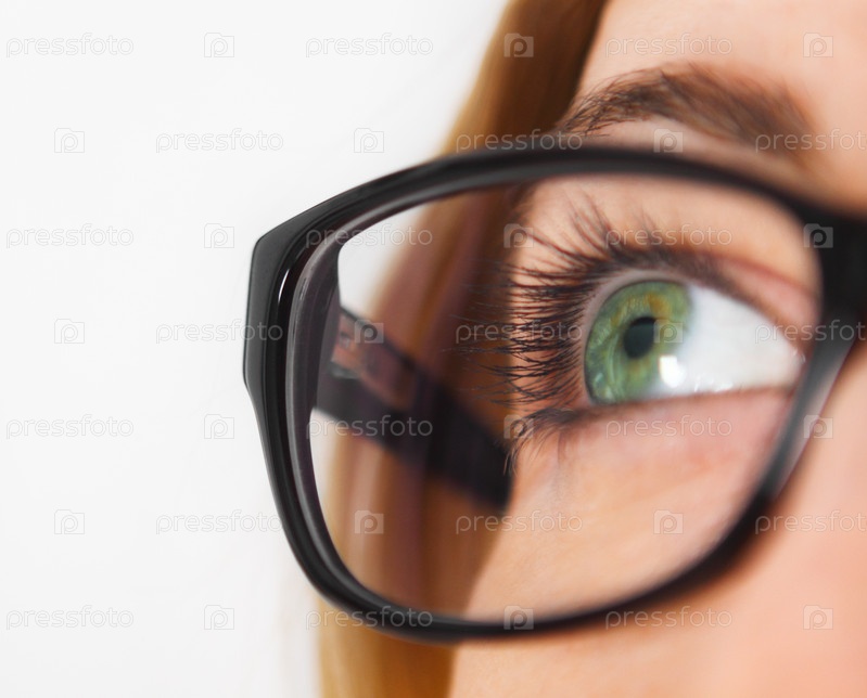 Глаз женщины в очках в черной оправе