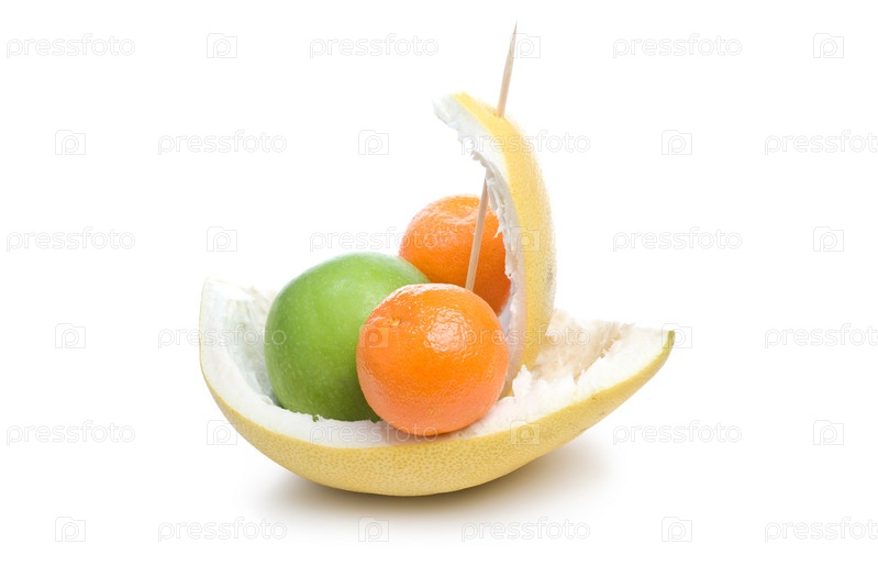 Яблоко и мандарины в лодочке из помело