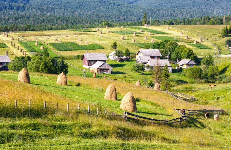 Стога сена в летних Карпатских горах, Украина