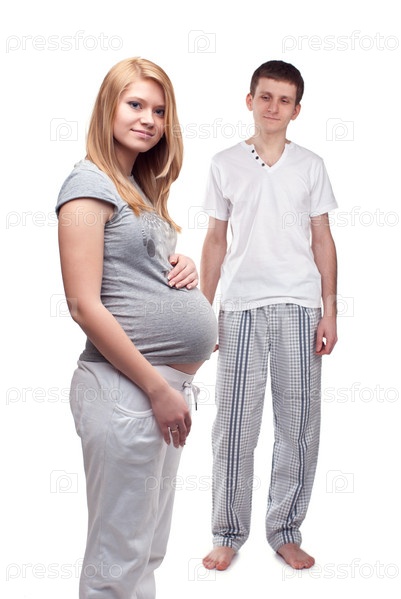 Молодой мужчина с беременной женой на белом фоне