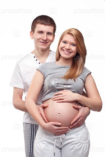 Молодой мужчина с беременной женой на белом фоне