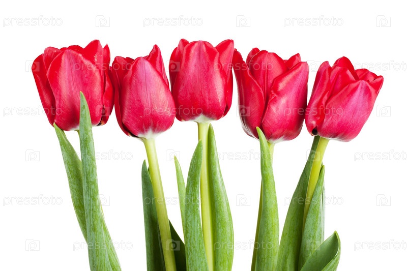 Пять красных тюльпанов на белом фоне
