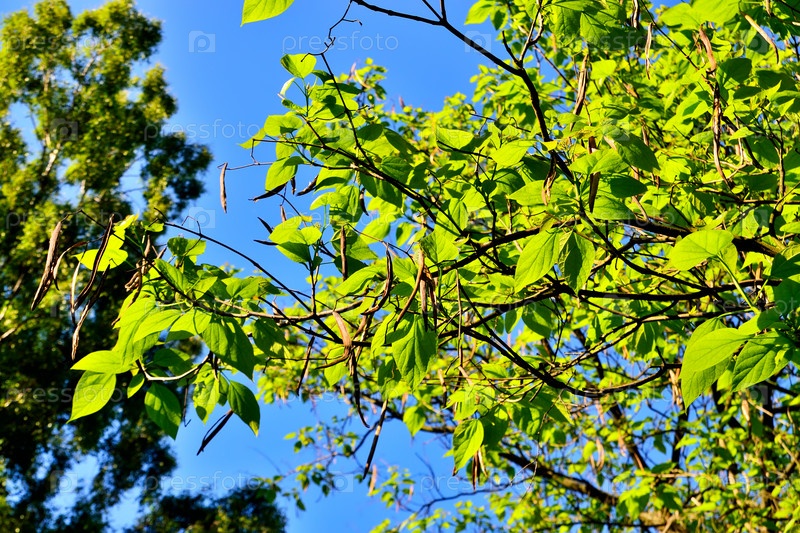 Катальпа бигнониевидная (Catalpa bignonioides) листья и плоды в крупном плане