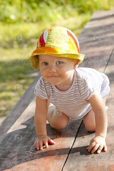 Маленькая сероглазая забавная девочка на деревянном столе в парке
