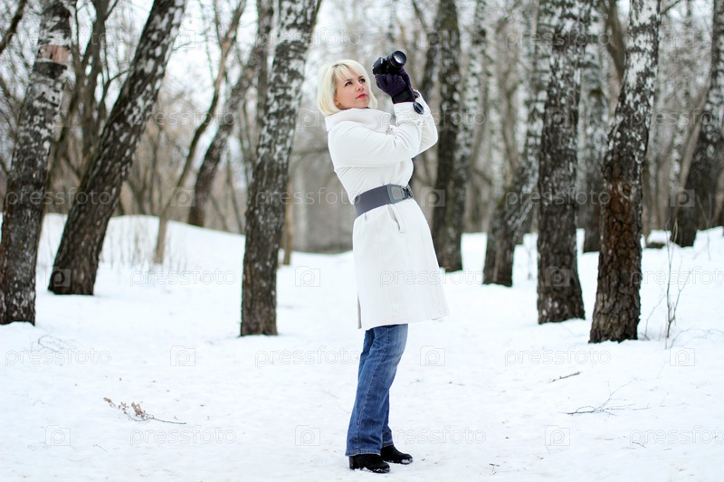 Молодая женщина с фотоаппаратом на открытом воздухе зимой