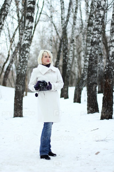 Молодая женщина с фотоаппаратом на открытом воздухе зимой