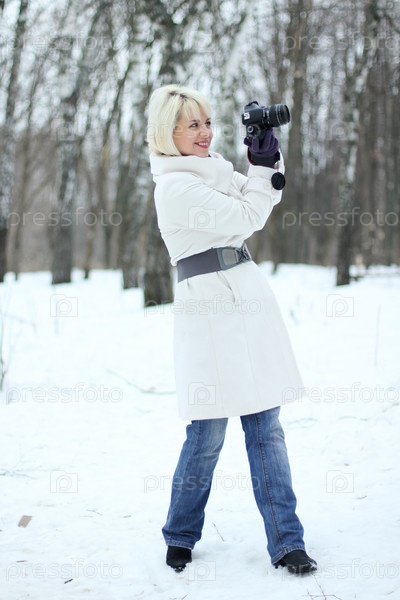 Молодая женщина с фотоаппаратом на открытом воздухе зимой