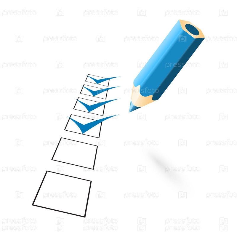 Синий карандаш и нарисованные галочки