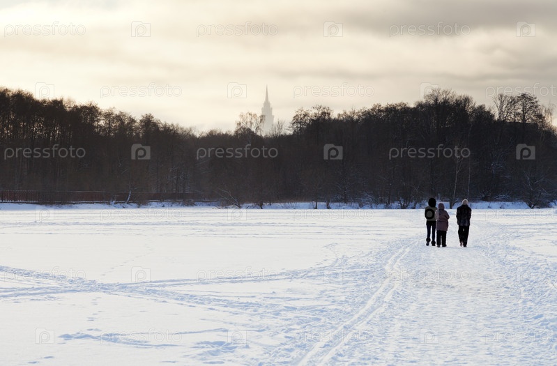 Люди идут по снежному полю