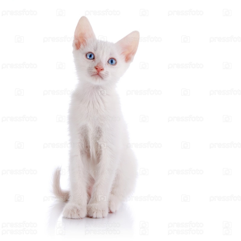 Белый котенок с голубыми глазами сидит на белом фоне