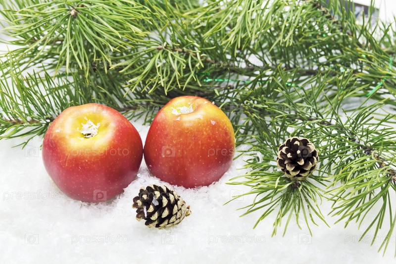 Красные яблоки, еловая шишка и сосновая ветка в снегу