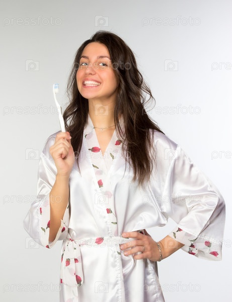 Женщина в пеньюаре с зубной щеткой